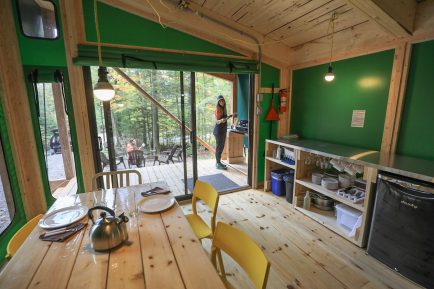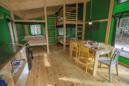 Ready-to-camp: Stay camping without owning any equipment. The ready-to-camp campers are set up on a wooden platform, equipped with a table, chairs, beds, a small refrigerator and cooking essentials. Outside, under the awning, a propane stove allows you to cook. Auxiliary electric heating. The park offers two types of ready-to-camp: – Traditional, which can accommodate a maximum of 4 people, located in the Rivière-du-Sud-Ouest (9) and Rioux (19) campsites – Étoile , accommodating up to 6 people, located at the Tombolo campsite (10)